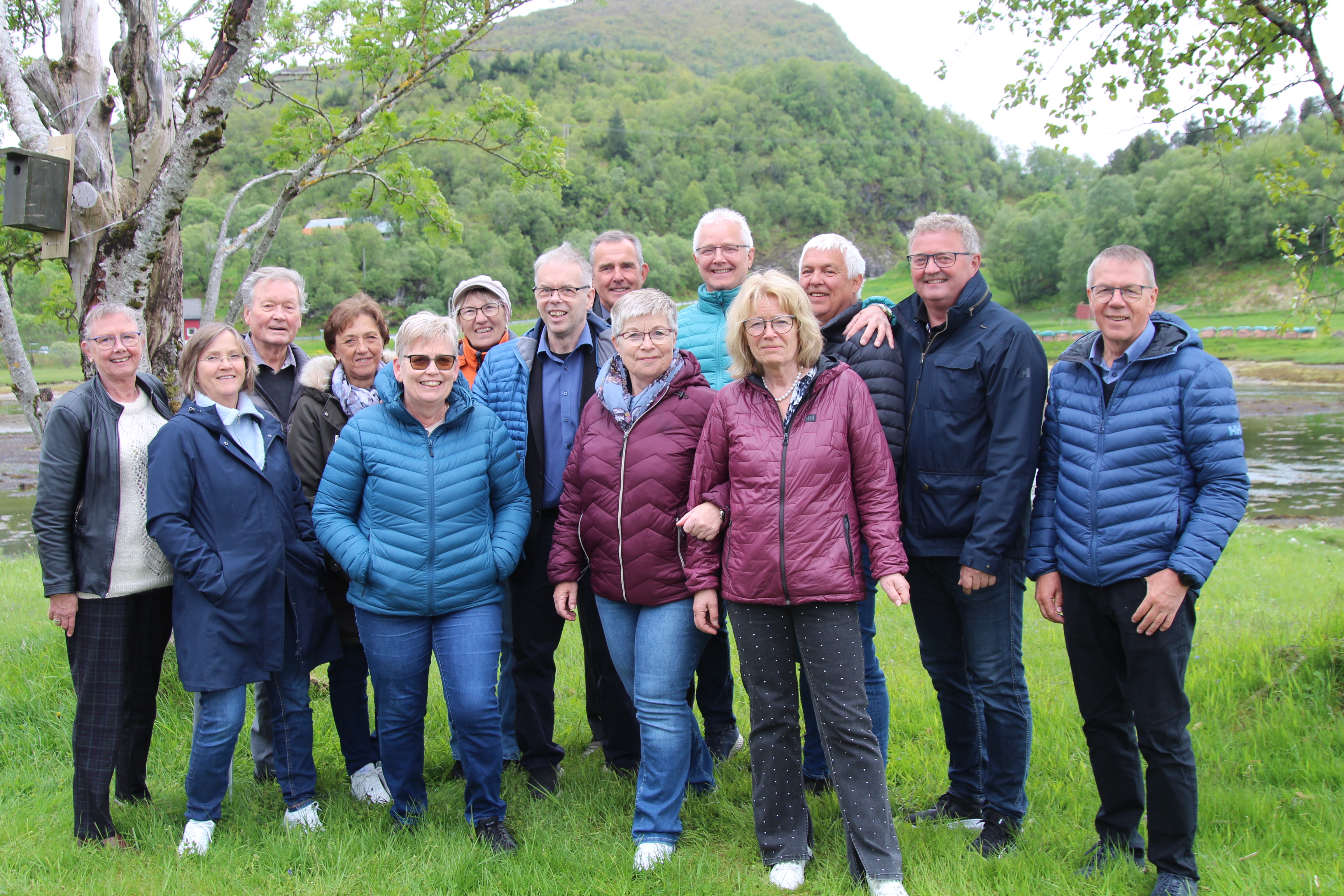 Frå venstre: Gerd Berge, Solveig Lien Gusdal, Kåre Øvreberg, som var ein av lærararne, Mona Hellebust Beitveit, Torill (Vik) Slagnes, Målfrid Aasen, Svein Arild Endal, Bjørnar Thunem, Else Helen Thorstensen, Ståle Vik, Marit Aahjem, Rune Løvold, Leif Løvold, Odd Westerås. Mari-Anne Kragseth, Anne Margrete Aahjem Brekkan var også innom på kvelden, medan Gunvor (Benjaminsen) Eikeset, Kari Thue Venøy, Anne Helen (Varpe) Gimmestad, Solveig Erdal Lindås, Anne Skorge Venøy, Magne Lundehaug og Harald Aahjem ikkje hadde høve til å møte. FOTO: Ole Magne Kvalsvik