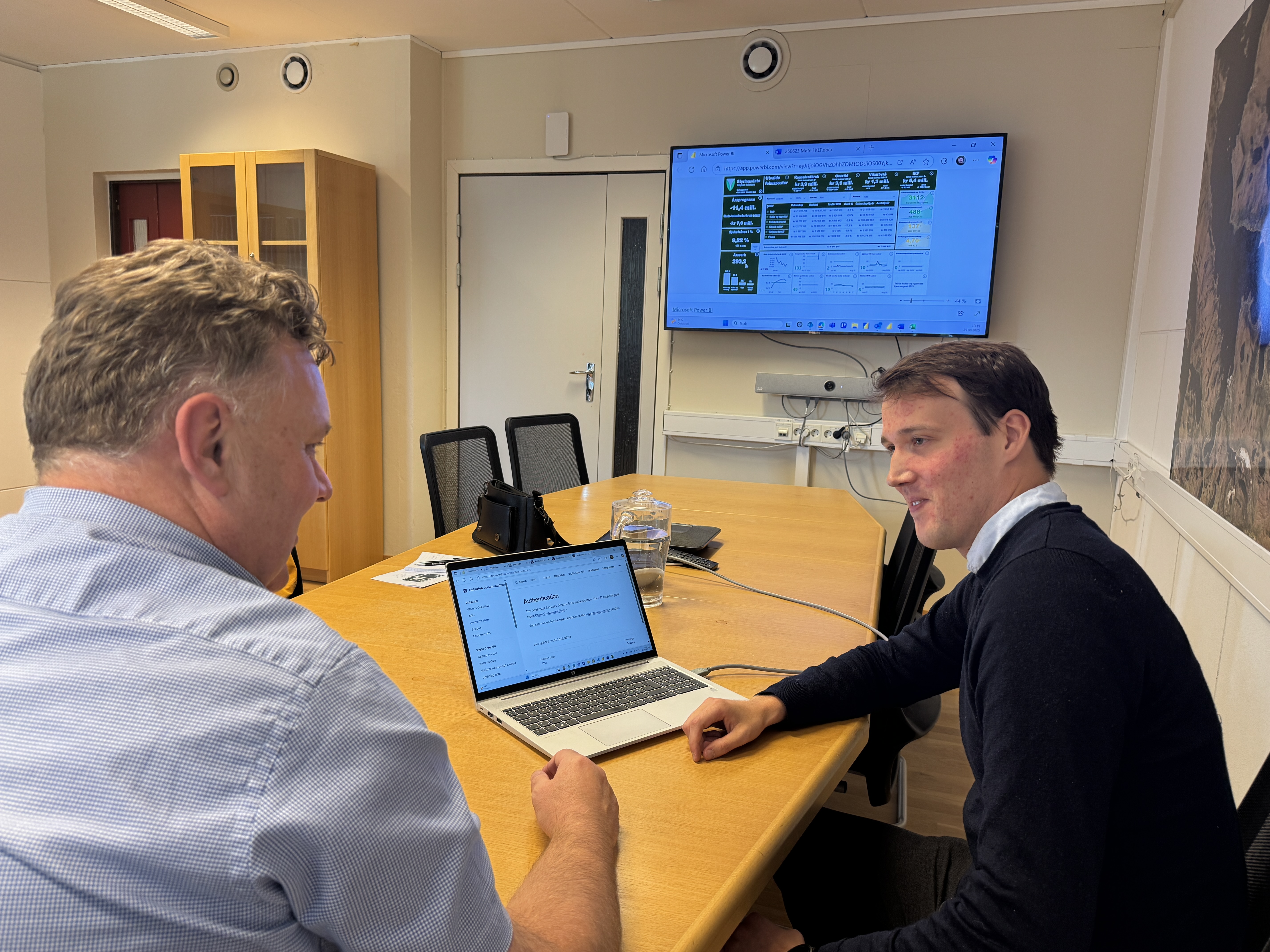 INNSYN: Sanntidstala på Vanylven kommune sine sider gir innsyn i drifta, men årsverka ikkje heilt oppdaterte her. Kommunedirektør Andreas Nørve (t.v.) seier ein vil sjå nærare på kvifor ein ikkje ser igjen 26-tala, og når ein får opp 278, som er det nye talet på årsverk i kommunen. – Vi har ikkje forventa fullt nedtrekk per august. Så årsverknedgangen kjem til å komme inn på oversikta etter kvart, seier økonomisjef Elias Botnen (t.h.).Vi får også opplyst at ein ser på detaljar rundt publiseringa for å få den så riktig som mogleg. FOTO: Tanja Anett Thunem