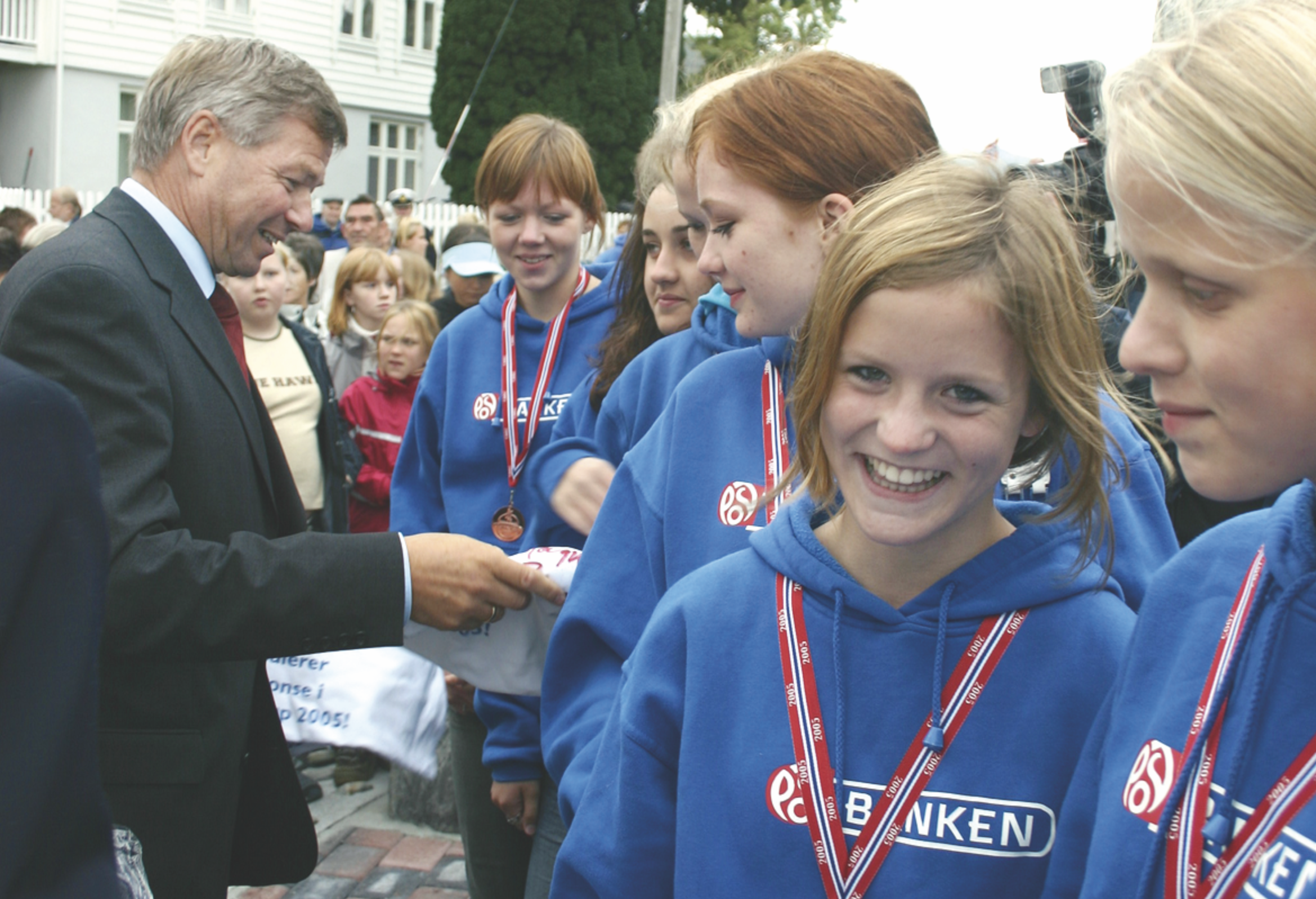 Jentelaget frå Åheim som gjorde det så skarpt i Norway Cup i år vart gjort ekstra stas på under opninga av Solsikkedagane fredag. Statsministeren overleverte dei kvar si signerte solskikke-skjorte. Jan Helgøy hadde hatt dei med seg over til Årvika slik at Bondevik fekk høve til å signere dei på ferja. Under overleveringa la vi merke til at fotballinteresserte Bondevik også nemnde laget frå staden der han bur. Kolbotn, som har eit framifrå jentelag. Jentene frå Åheim hadde elles både medaljar og pokal med seg. Jentene som får skjorter av Bondevik er frå venstre: Anita Westerås, Ingvild Thue Hvattum, Stine Mari Hellebust, Ivonne Kroken Ekremsæter og Anne Hellebust. FOTO: Arkiv