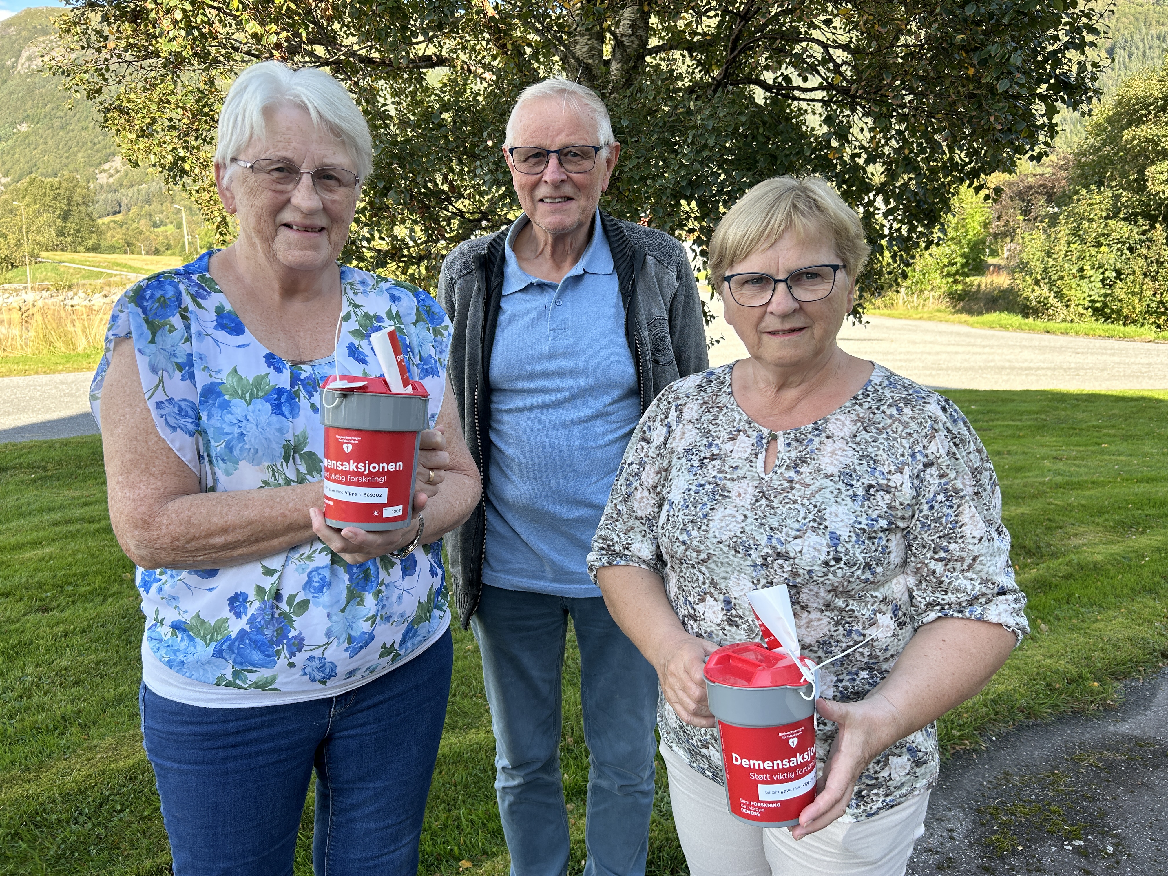 Denne veka er Helselaget Vårsol med på den landsdekkande innsamlingsaksjonen for demens. Bjørg Marit Berge Taklo (t.v), Lasse Rindal og Ingunn Kvalsvik Worren håper på like godt engasjement som i fjor. FOTO: Emilie Rætta