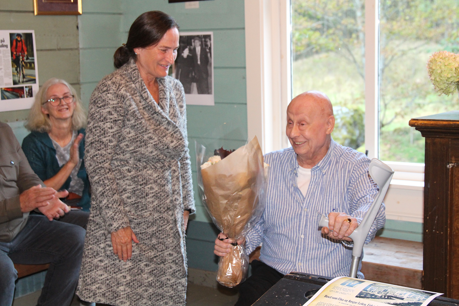 OPNA UTSTILLINGA: Gerhard Leiten fortalte litt om mora sitt liv og virke og får her blomar frå Torill Bernatek i Vanylven kunstlag.