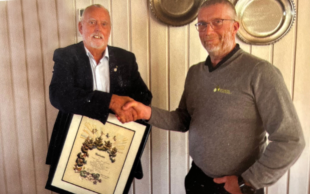 LANG OG TRU TENESTE: Terje Kolstad (t.v.) fekk takk for innsatsen av Anders Røkkum, avtroppande styreleiar i Skogselskapet. FOTO: Privat