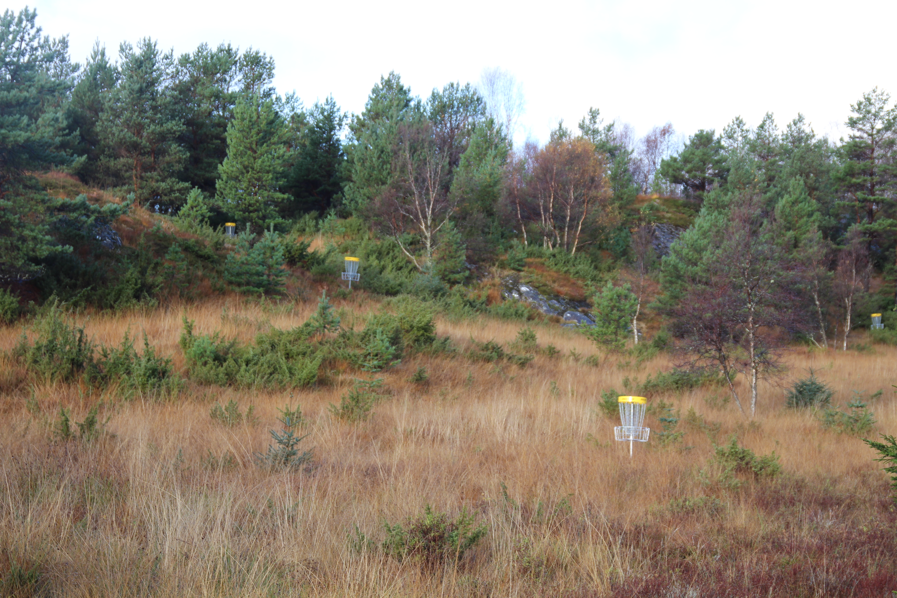 AKTUELT OMRÅDE: Om den nye trafostasjonen skulle verte plassert her, nord for Åheimlida, der turvegen til Lyngfjellhola og andre turmål går, vil han komme midt i eit mykje brukt fritidsområde, der ein no også ser at det er i ferd med å komme på plass korger for frisbeegolf.