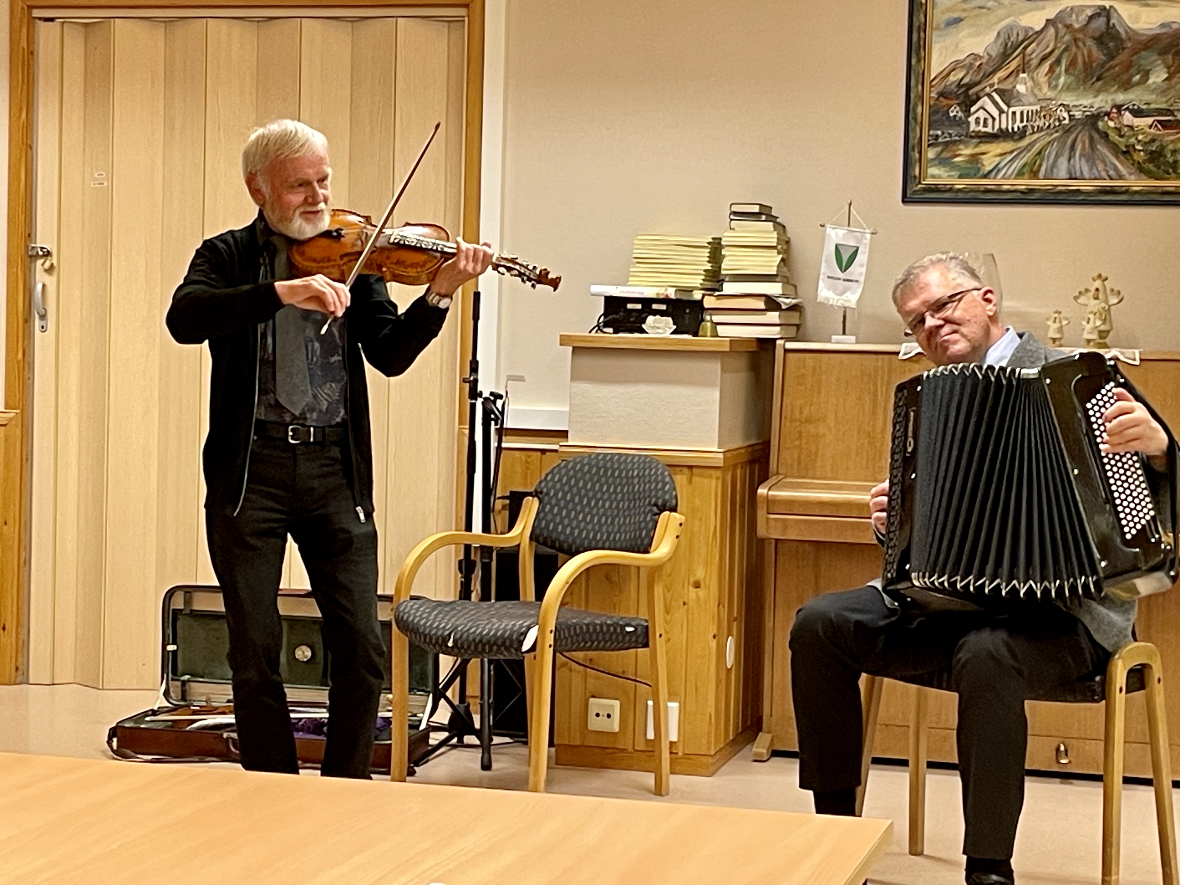 UNDERHELDT: Arne Sølvberg og Håvard Svendsrud spelte måndag her på Syvdetun og på omsorgssenteret på Fiskå i regi av den kulturelle spaserstokken.