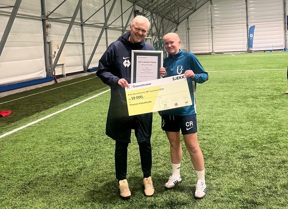 PRISSATT: Ole Per Kragset vart overraska med prisen "Årets Grasrottrener" då han møtte Amalie Ervik Røys i Vanylvshallen torsdag.