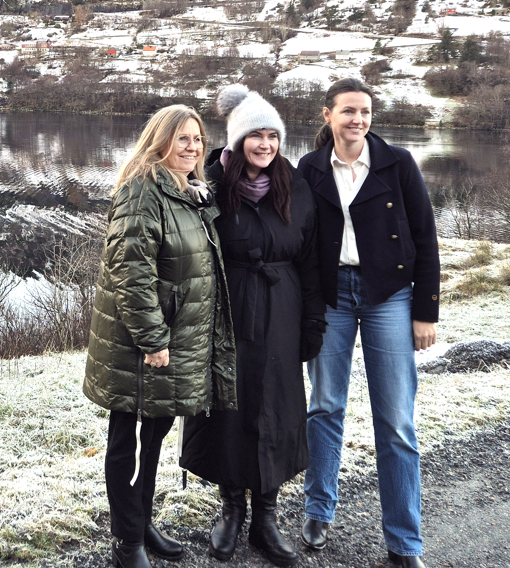 PÅ SYNFARING: Anne Kristine Linnestag, samferdsel og Monica Moldvær, utdanning, stortingsrep. Høgre og Elisabet Hatlenes, leiar i innsatsgruppa for Stad skipstunnel.