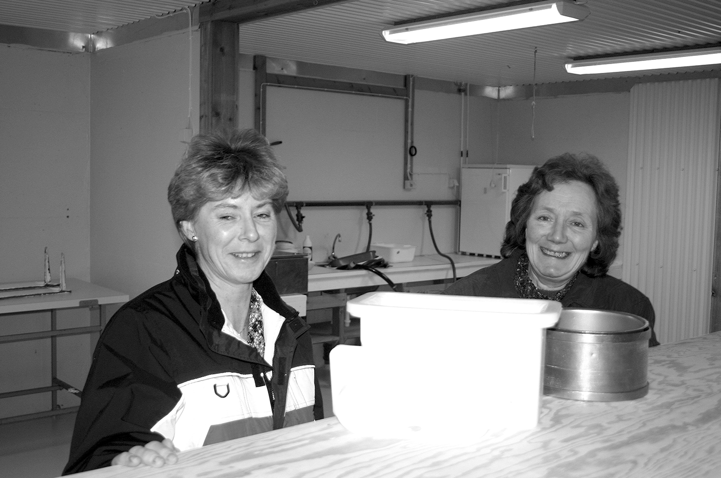 OSTEFORMENE frå meieriet i Syvde er på plass. No gjeld det å få fylt dei med ost frå eige ysteri og plassert dei i modningsbua dei har fått laga i eit eige rom i lokala sine. Randi Berge (t.v.) - gardbrukar på Sylte og Gudveig Berge med gard på Fiskå, gler seg. Elin Vik Eriksen som driv gard på Åheim, var ikkje tilstades då vi tok biletet.